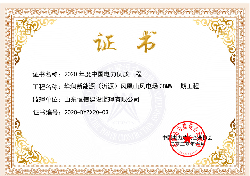 华润新能源(沂源)凤凰山风电场 38MW 一期工程:2020 年度中国电力优质工程