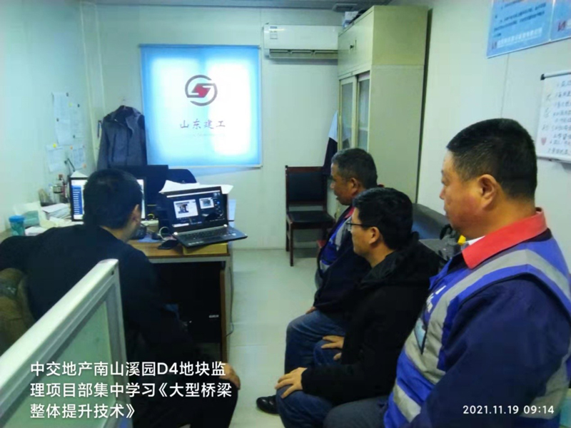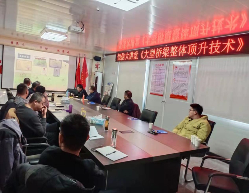 本次恒信监理大讲堂由公司总工程师高厚儒带队,采用线下与线上相结合的方式,公司年轻骨干人员现场参会,公司其他监理人员通过线上参加会议,项目聘请了上海天演建筑物移位工程股份有限公司技术总工张昊进行授课,会议上主要讲解了本工程顶升概况、重点难点、施工中应注意事项、如何保证顶升中施工安全、已完成顶升的桥梁工程业绩等内容。通过本次学习让我们监理人员了解桥梁顶升技术参数要求,施工中应注意控制的重要节点及关键工序的控制要点,既拓宽了监理人员的桥梁顶升技术知识,也为后期现场桥梁顶升监理工作做更好的铺垫。